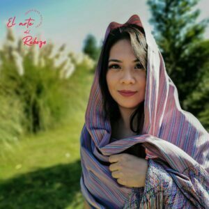Si deseas un gorro, pon primero el rebozo en tu cuello como si fuera una bufanda y después enrollando las puntas sobre el mismo para posteriormente hacerlo gorro